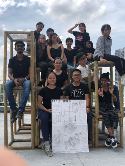 1:1 Tectonics: Design Principles, Anthropometric and Ergonomic Exploration. A group project that allowed students to play with and build a structure using bamboos as a main material and a given supporting material. With Bamboo and Jute Rope as a supporting material for our group, we chose leaning as a banal movement to make a structure for. By researching anthropometrics and ergonomics, we understood the angles and what draws people to lean on something. An equilateral triangle was chosen as the basic shape of the structure and a skin made from bamboos were wrapped around it giving a comfortable space to lean. The concept for the structure was for people to understand and have the confidence to lean by looking at the connection and the stability of the structure hence the reason why we opted for an open structure.
